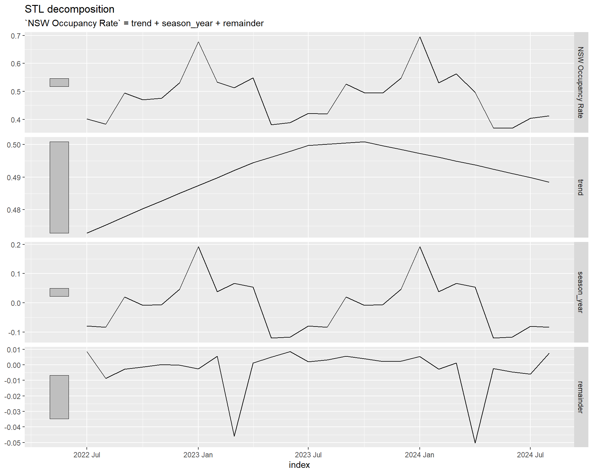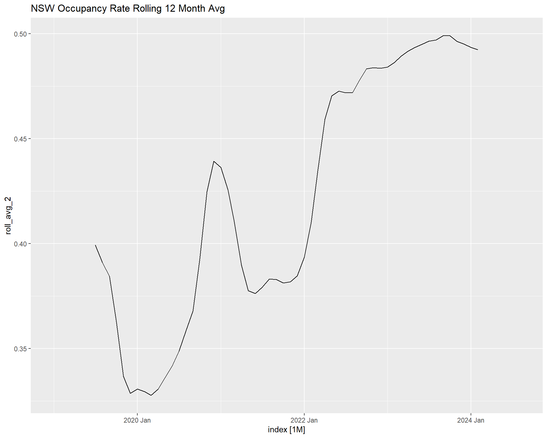 To understand intra-year dynamics, the analysis then focuses on monthly patterns. Average 12 month rolling average of the NSW Occupancy Rate shows a stable trend from May 2022 onwards.
