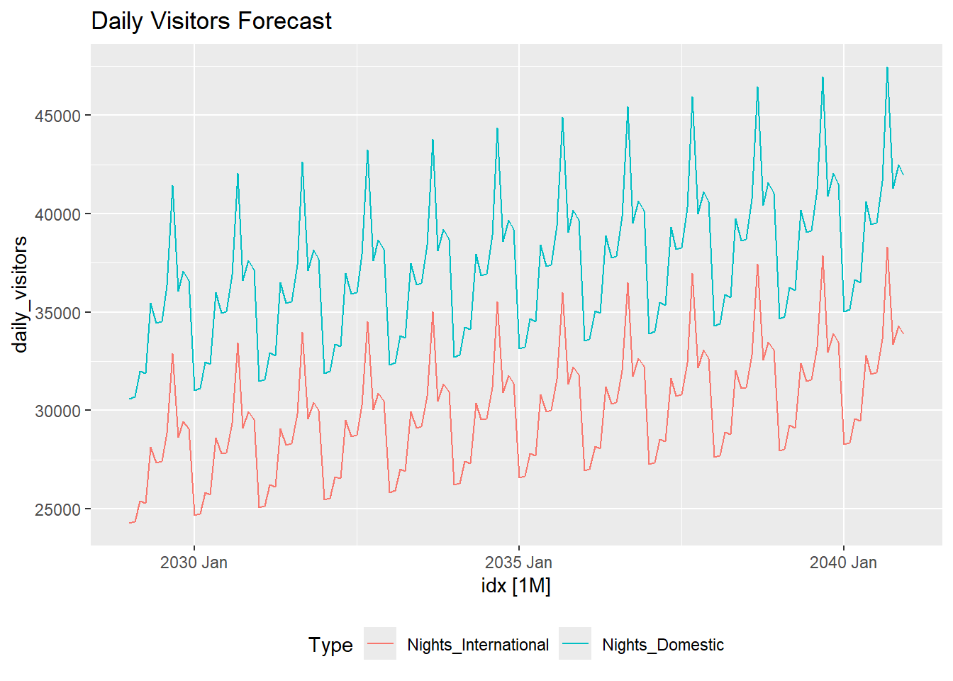 ts_stay_nsw <- tr_stay |>filter( Region =="New South Wales", Metric %in%c("Caravan park or commercial camping ground","Caravan or camping - non commercial") )int_avg <- (ts_stay_nsw$`International Year ending March 2024`[[1]] + ts_stay_nsw$`International Year ending March 2024`[[2]]) /2dom_avg <- (ts_stay_nsw$`Domestic overnight Year ending March 2024`[[1]] + ts_stay_nsw$`Domestic overnight Year ending March 2024`[[2]]) /2# join with monthly_forecastmonthly_forecast$avg_stay <-0monthly_forecast$avg_stay[monthly_forecast$Type =="Nights_International"] <- int_avgmonthly_forecast$avg_stay[monthly_forecast$Type =="Nights_Domestic"] <- dom_avg# calculate daily visitorsmonthly_forecast$daily_visitors <- monthly_forecast$monthly_forecast / monthly_forecast$avg_stay#plotmonthly_forecast |>autoplot(.vars=daily_visitors) +ggtitle("Daily Visitors Forecast") +theme(legend.position ="bottom")