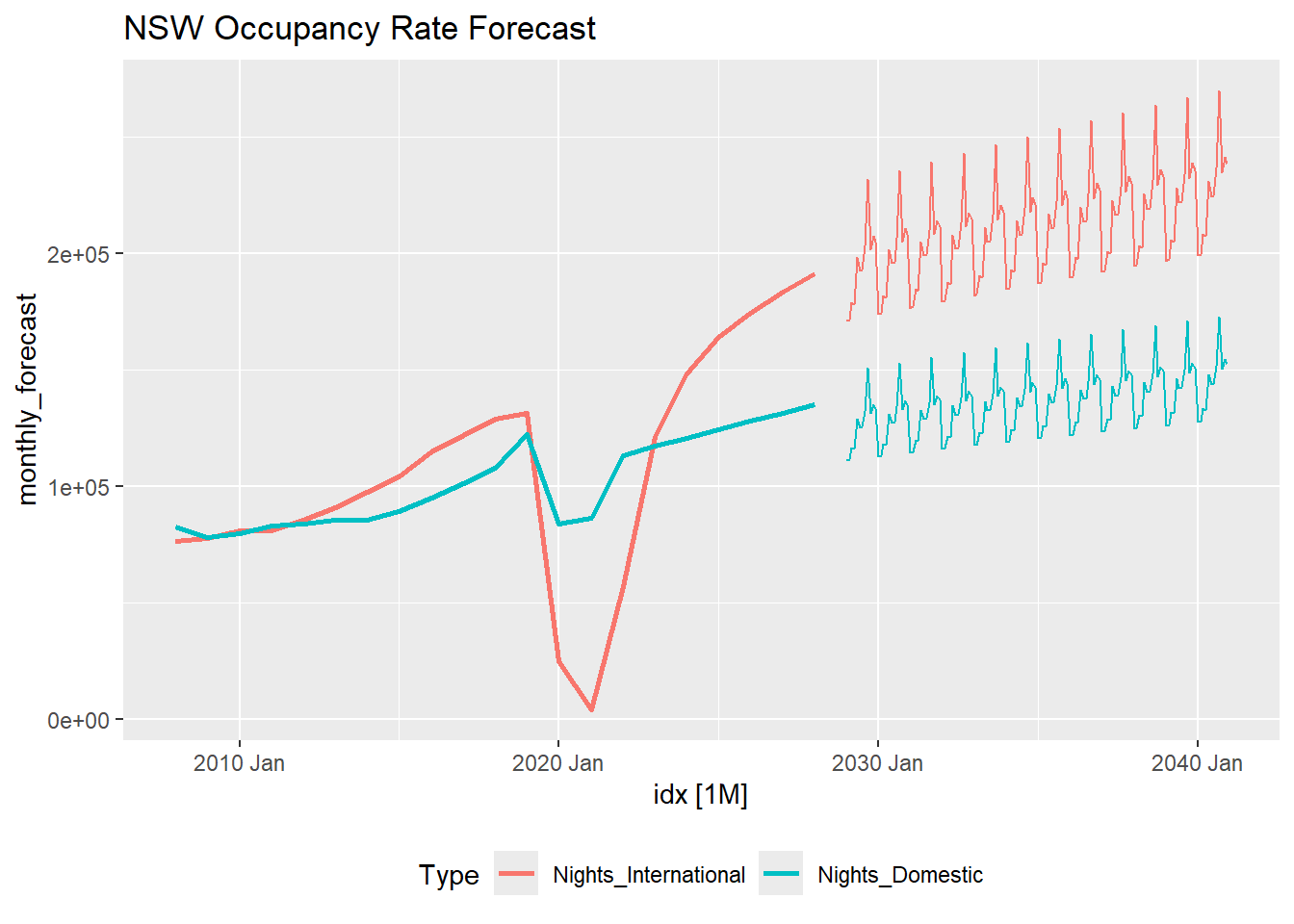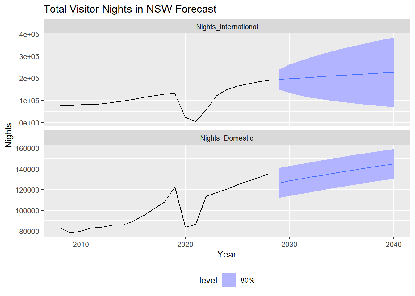 To demonstrate the practical application of our methodology, the following sections will walk through the R code used to generate these forecasts, starting with the overall NSW visitor nights.