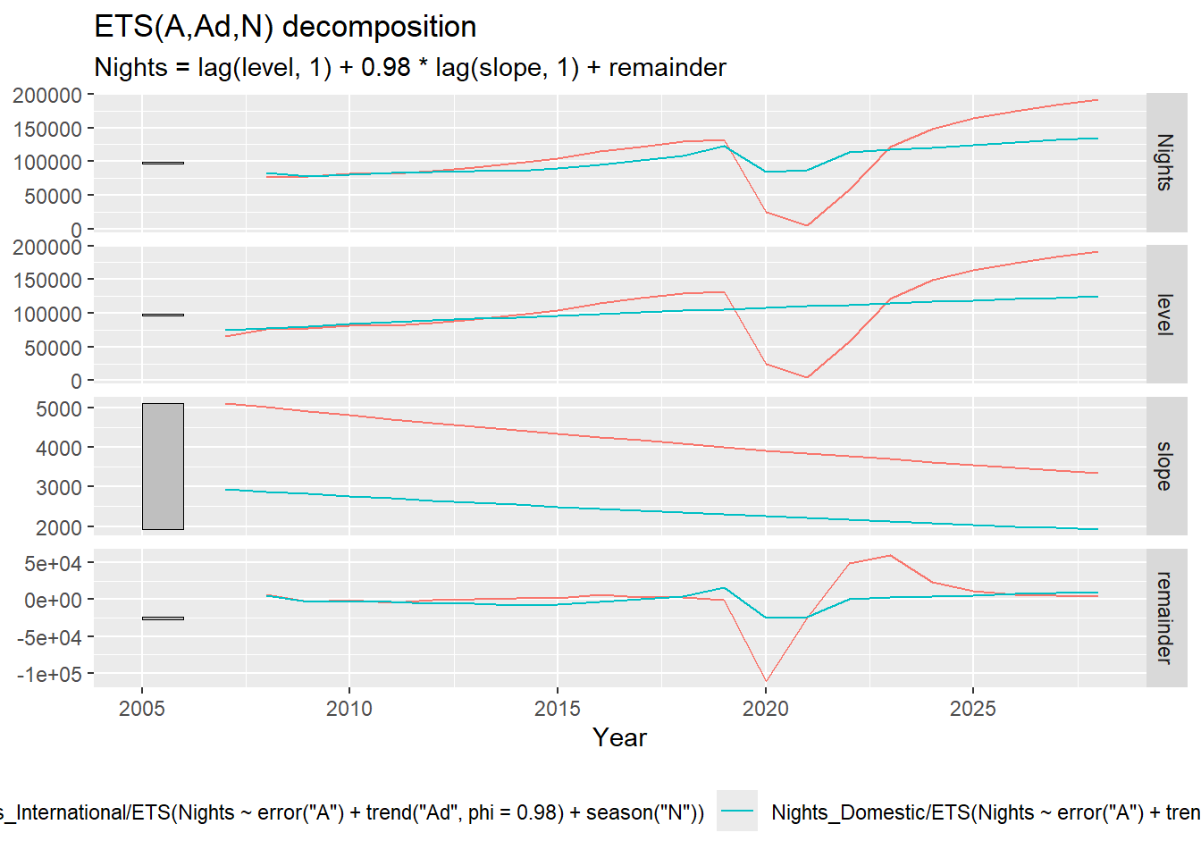 The initial step in our forecasting process involves loading historical tourism data and preparing it for time series analysis. This includes ensuring data types are correct and reshaping the data to be suitable for modeling. An Exponential Smoothing State Space Model (ETS) is then fitted to the annual visitor nights data. This model helps to project future visitor nights based on identified trends and patterns in the historical data. The resulting forecast, along with its decomposed components (like trend and level), is then visualized to assess the model’s fit and understand the projections.