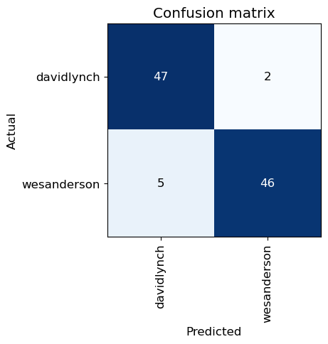 So that took about a minute to train*, and we now have a machine learning model that can tell the difference between Wes Anderson and David Lynch in over 95% of our examples.